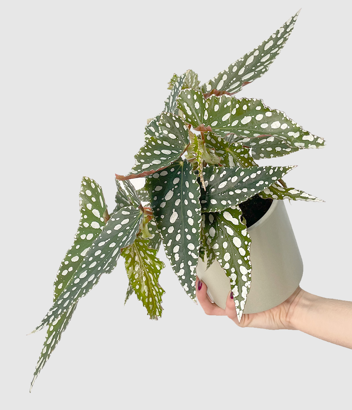 Begonia maculata je pisana in enostavna sobna rastlina. Liste ima zelene  v obliki kril z srebrnimi pikami. Ob pravilni negi vas bo obdarila z živo roza cvetki, ki dodajo poseben čar in teksturo. V pravih pogojih je hitro rastoča in zraste v velik grm. Vesela bo svetlega prostora in zalivanje, ko se zemlja skoraj izsuši. V naravi raste v brazilskem tropskem gozdu.