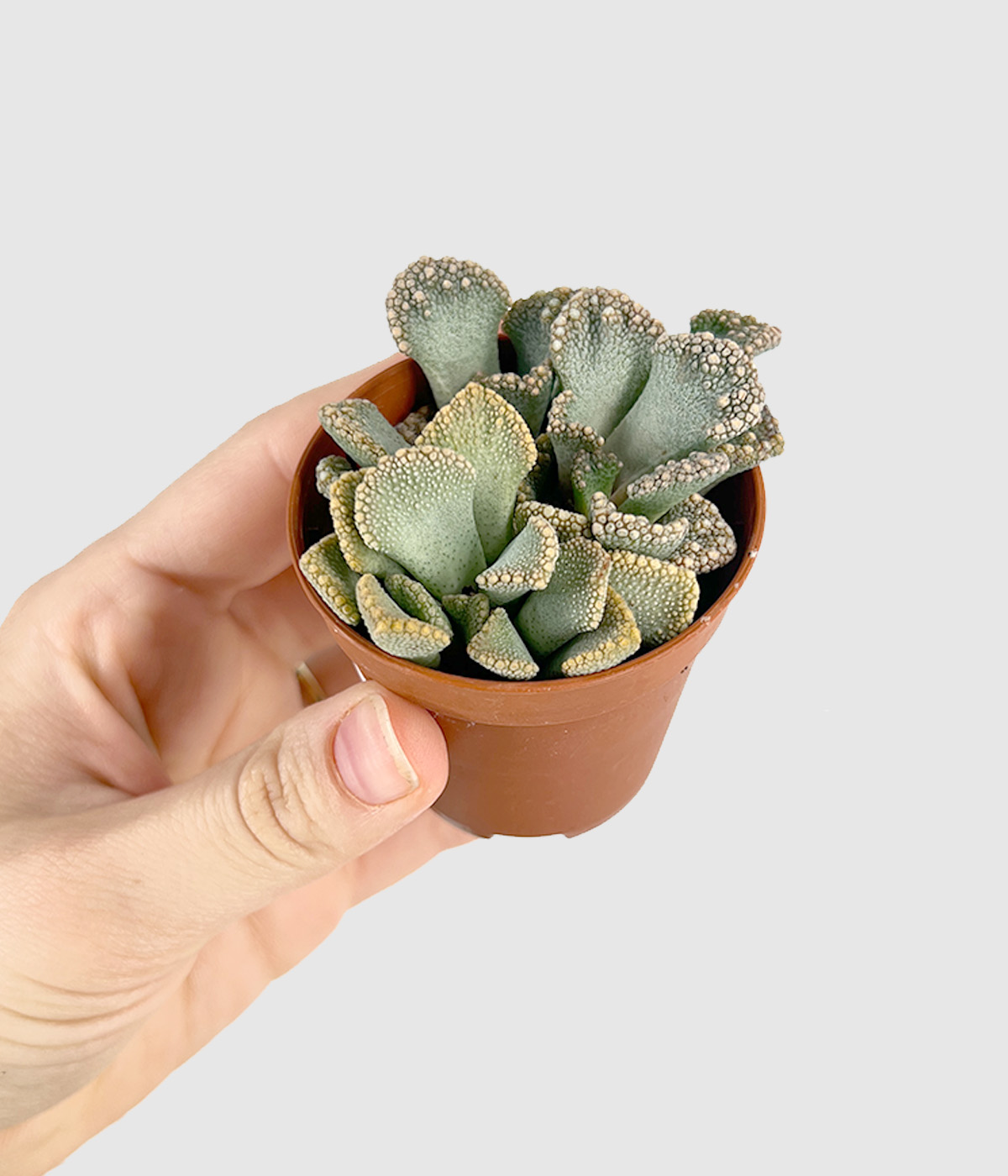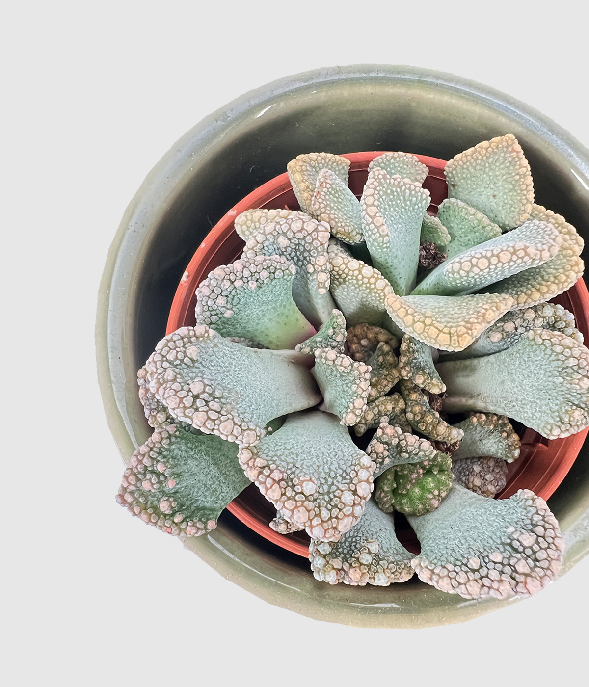 Titanopsis Calcarea je prikupna sukulenta z drobnimi hrapavimi listi, ki spominjajo na kamenčke.Ta naravna “kamuflaža” ji v naravi pomaga, da se skrije pred rastlinojedci.